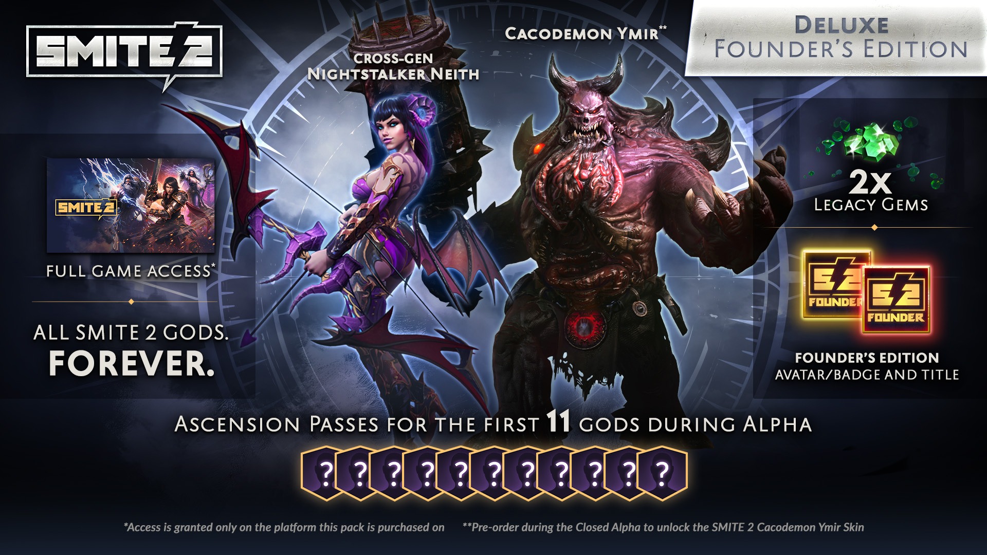 SMITE 2 - Founder’s Editions. SMITE 2 full game access*. Includes all SMITE 2 Gods, forever. Best Software for Crisis Mitigation smite 2 all gods forever and related matters.. Founder’s Avatar/Badge and Title. SMITE 2 Cacodemon Ymir Skin**. 2x Legacy Gems. Cross-Gen , SMITE 2 | The SMITE 2 Founder’s Edition will be available soon , SMITE 2 | The SMITE 2 Founder’s Edition will be available soon